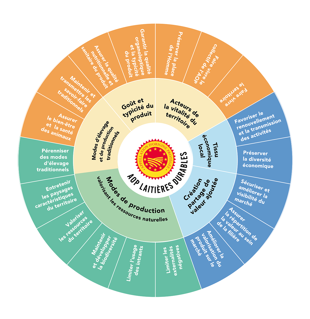 La démarche AOP laitières durables vise à apporter encore plus de transparence sur les pratiques et des réponses globales sur les trois piliers du développement durable : social, environnemental et économique. Cette démarche a pour socle les plans de filières signés en 2017 à la suite des États généraux de l’Alimentation pour lesquels un certain nombre d’engagements ont été validés : maintien de la biodiversité, réduction des gaz à effet de serre…